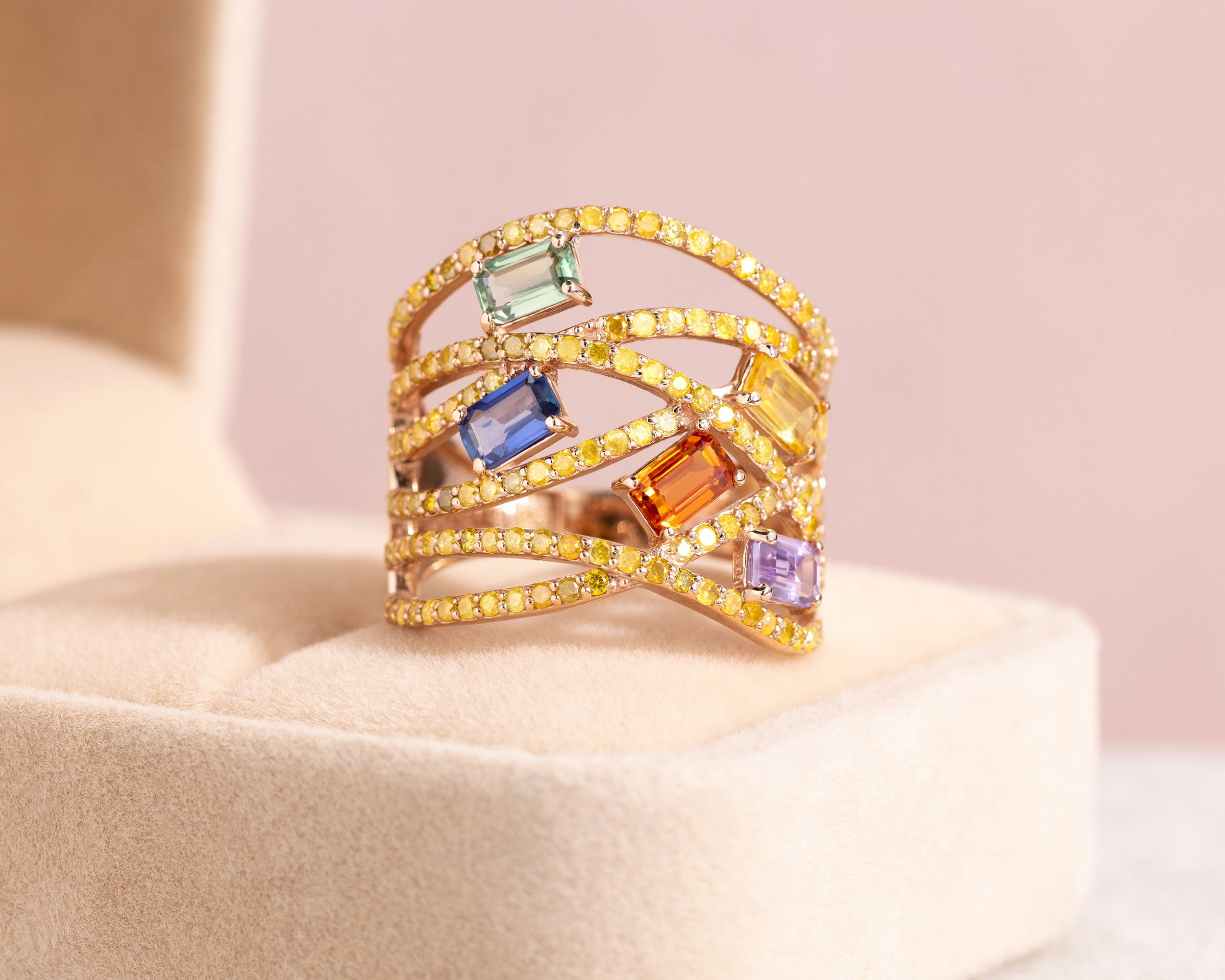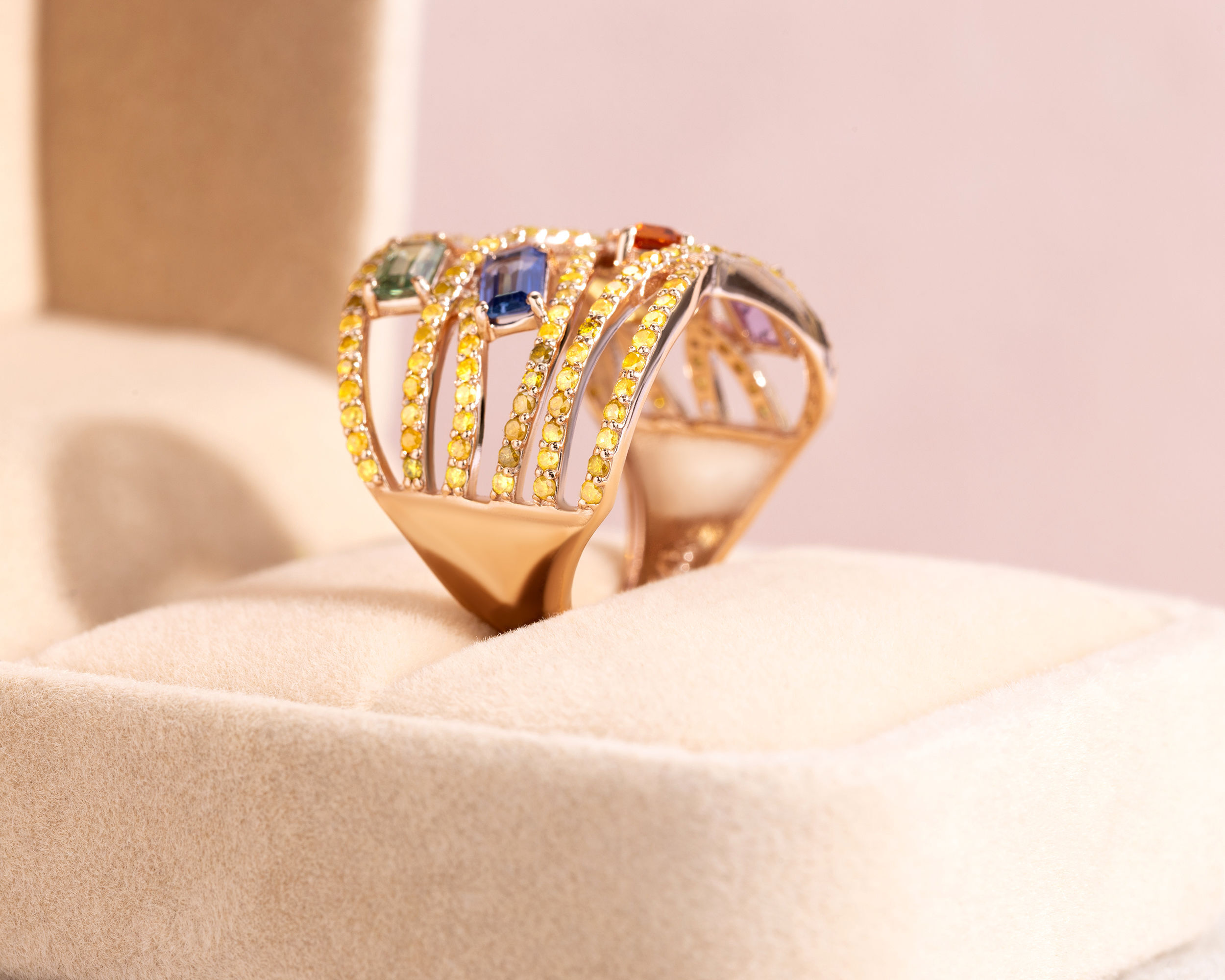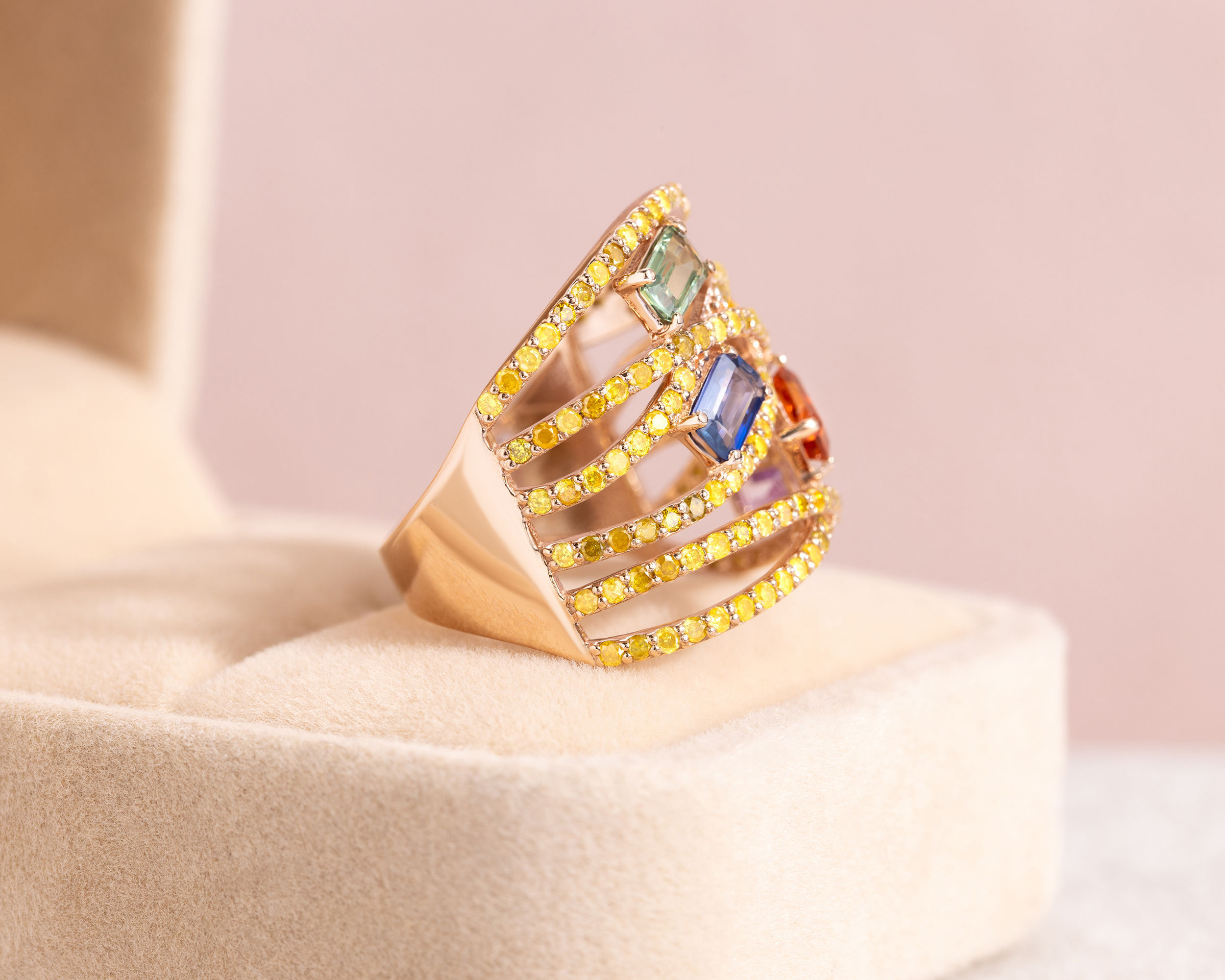 3.96 Ct Sapphire Mix Colors & Fancy Vivid Yellow Diamond 14k Rose Gold Ring