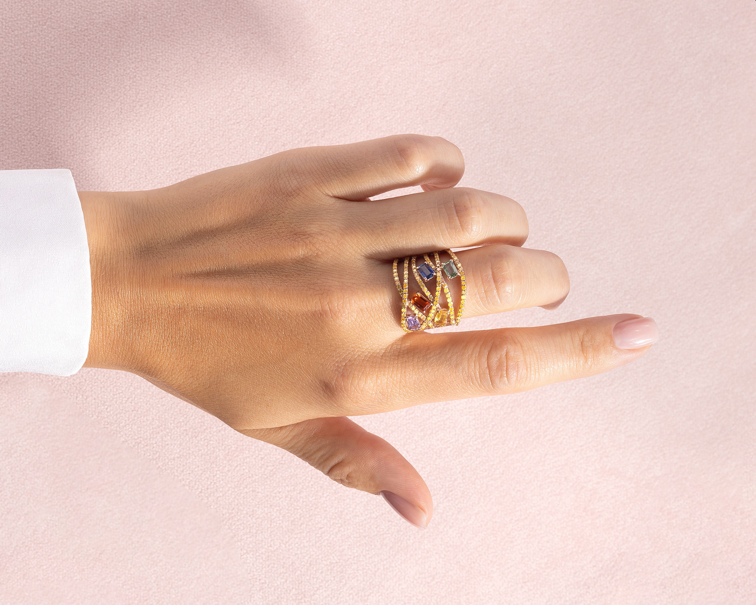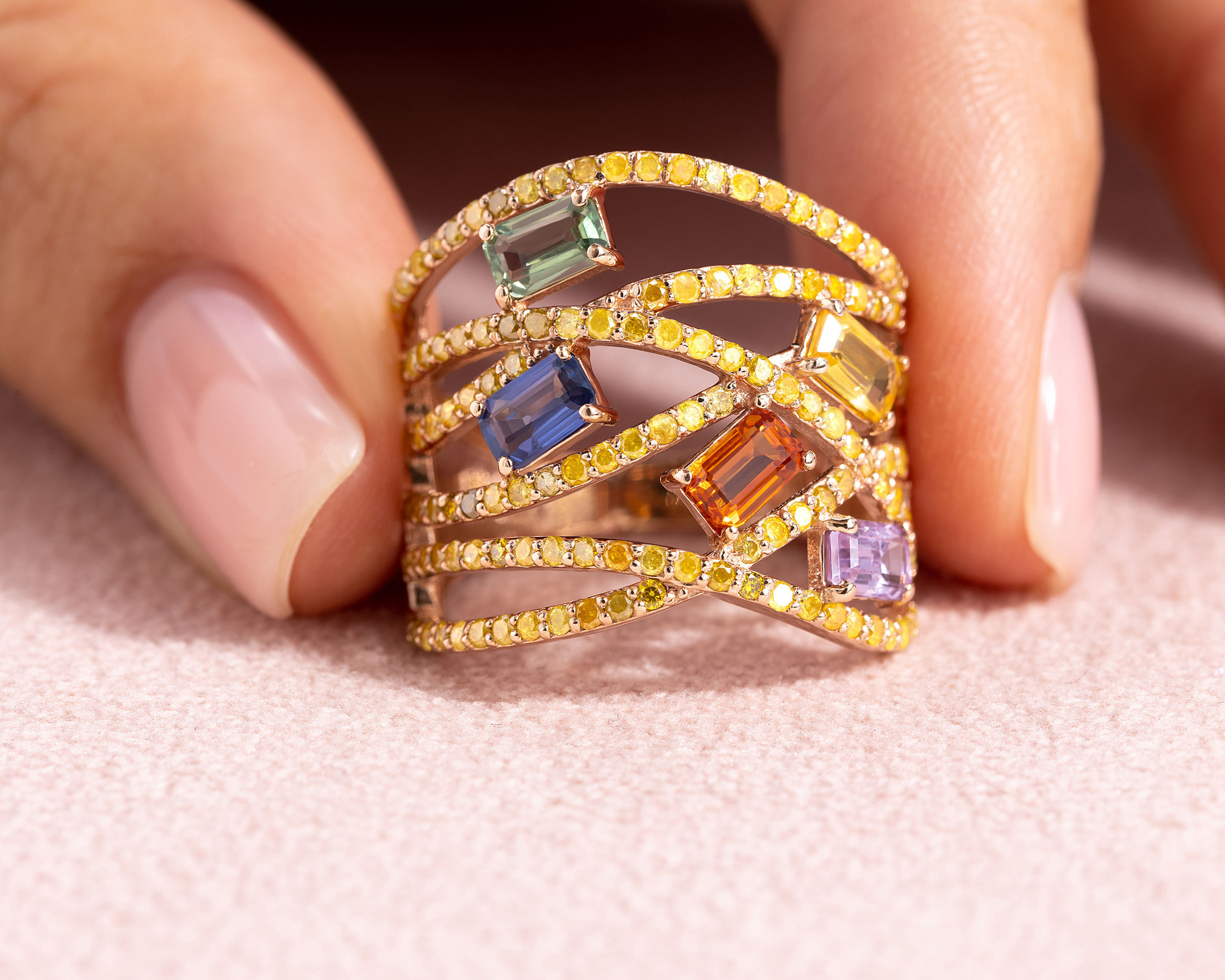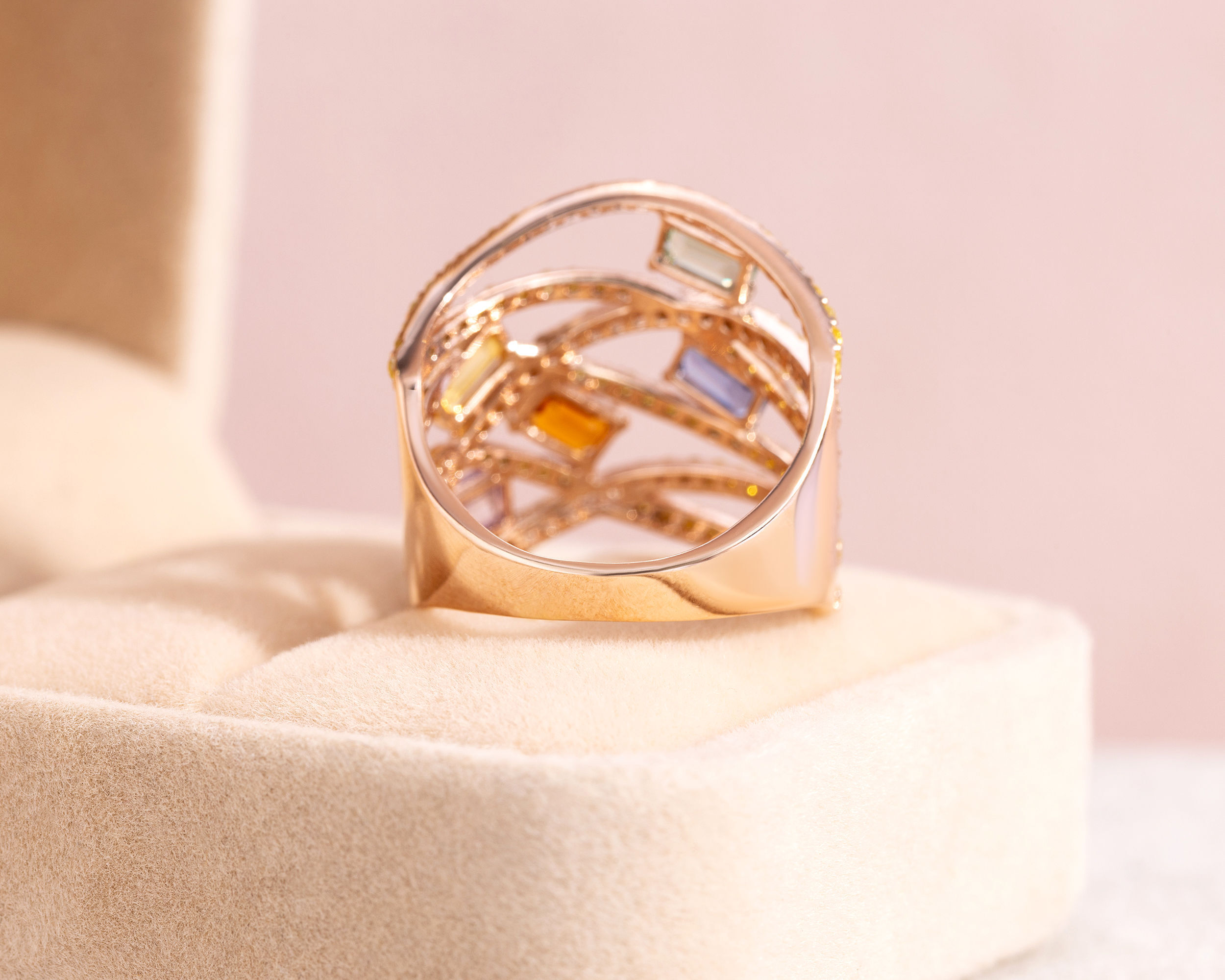 3.96 Ct Sapphire Mix Colors & Fancy Vivid Yellow Diamond 14k Rose Gold Ring