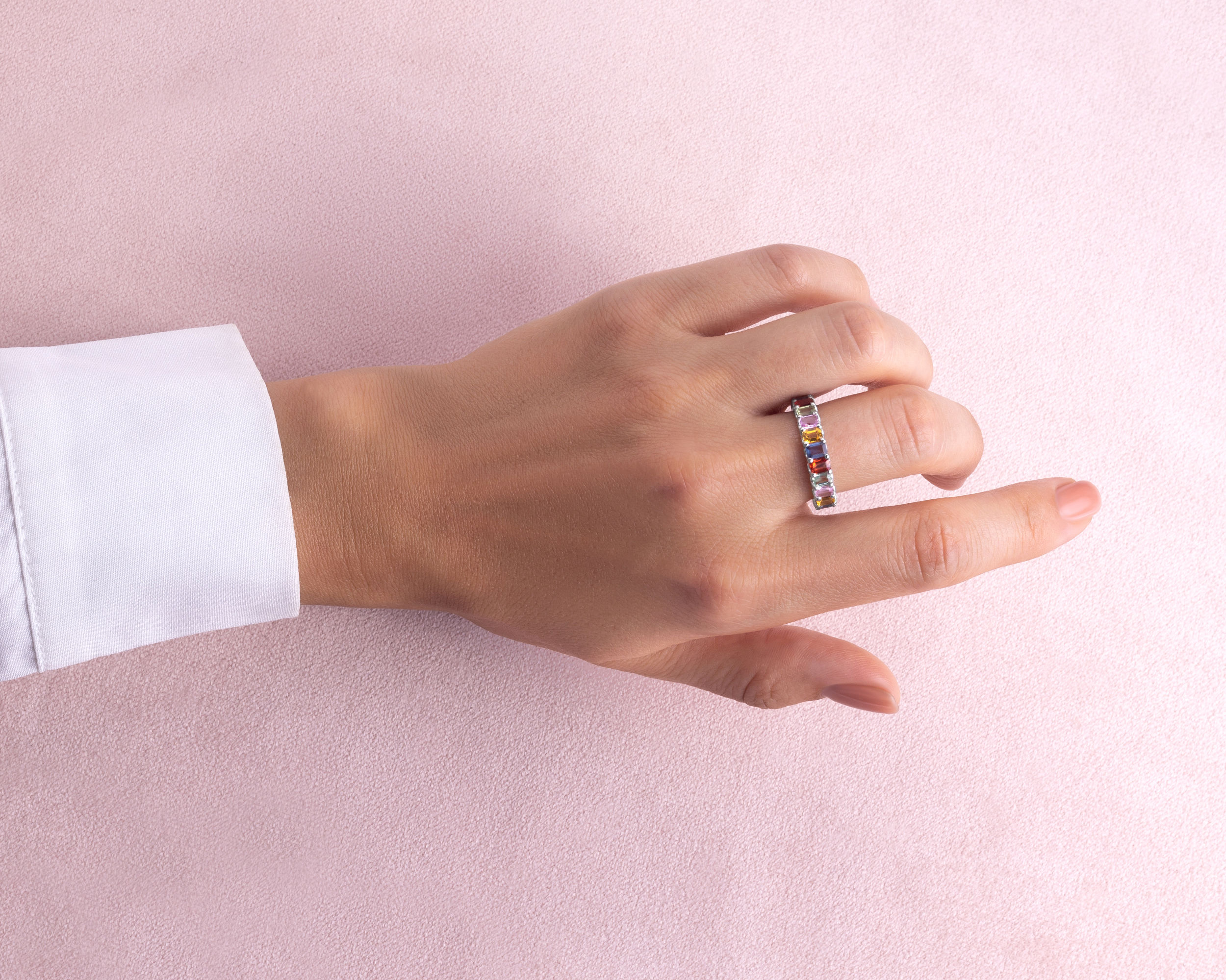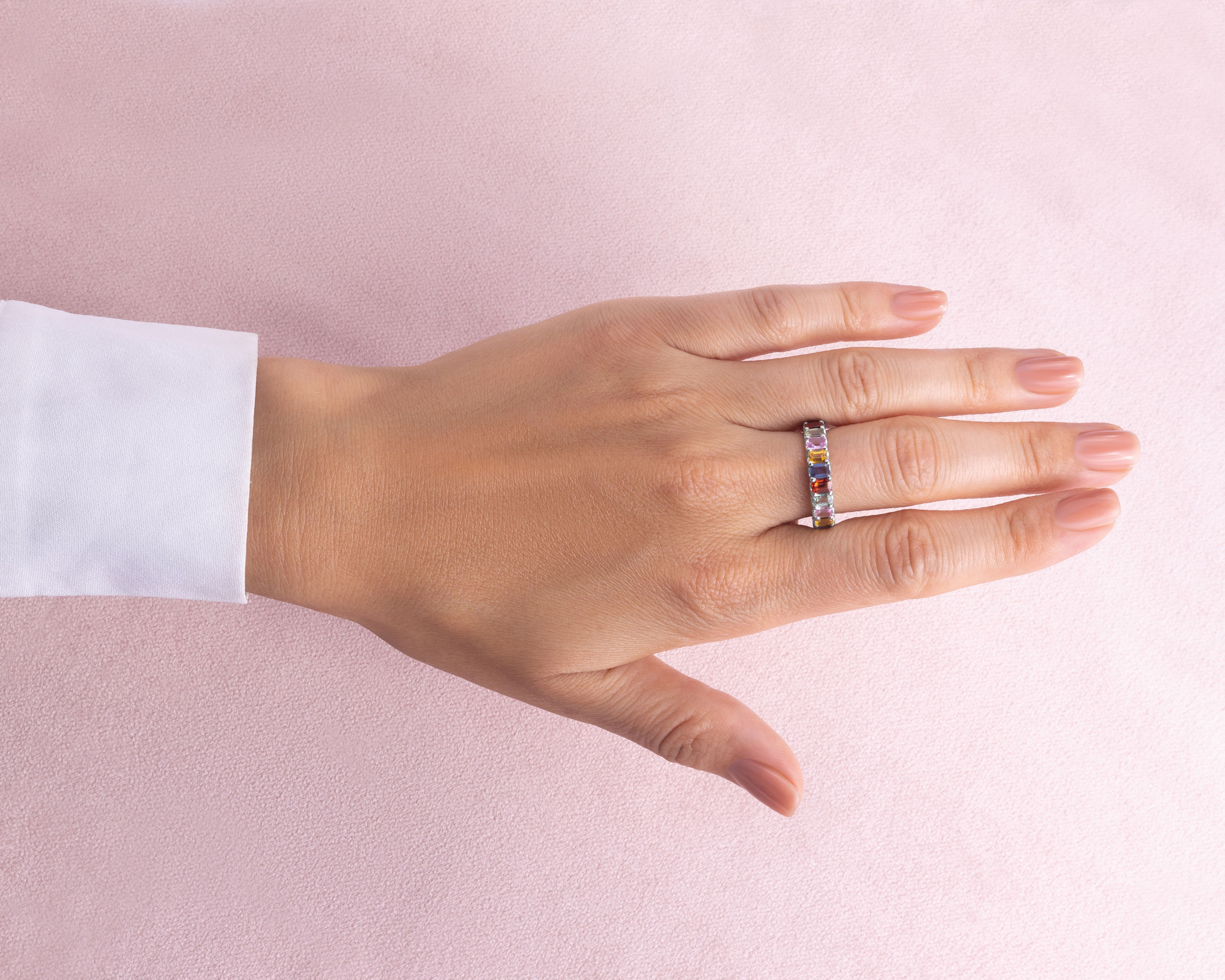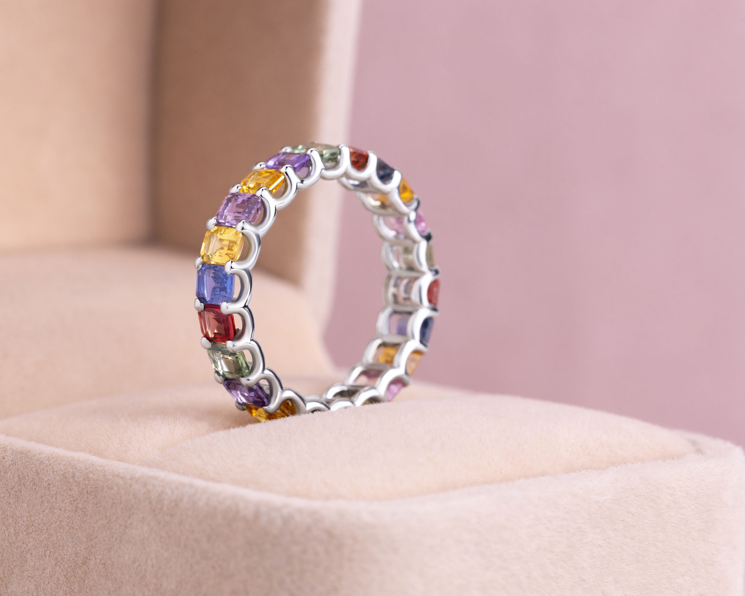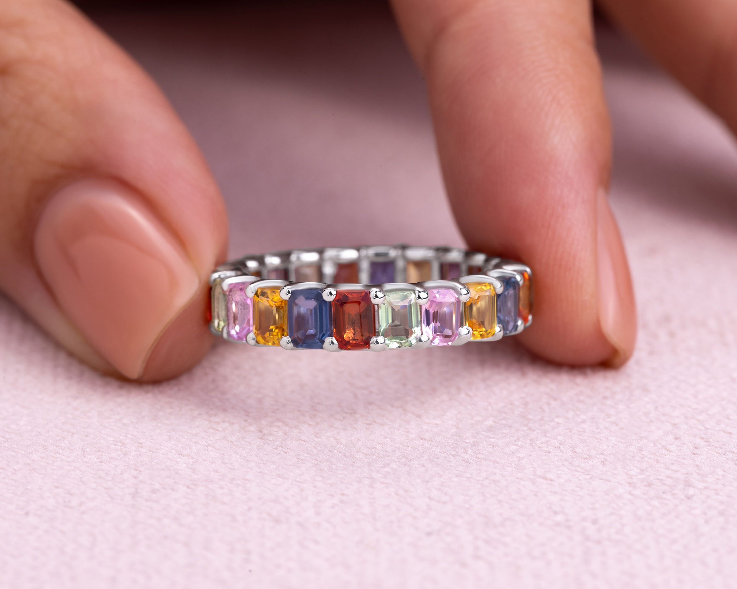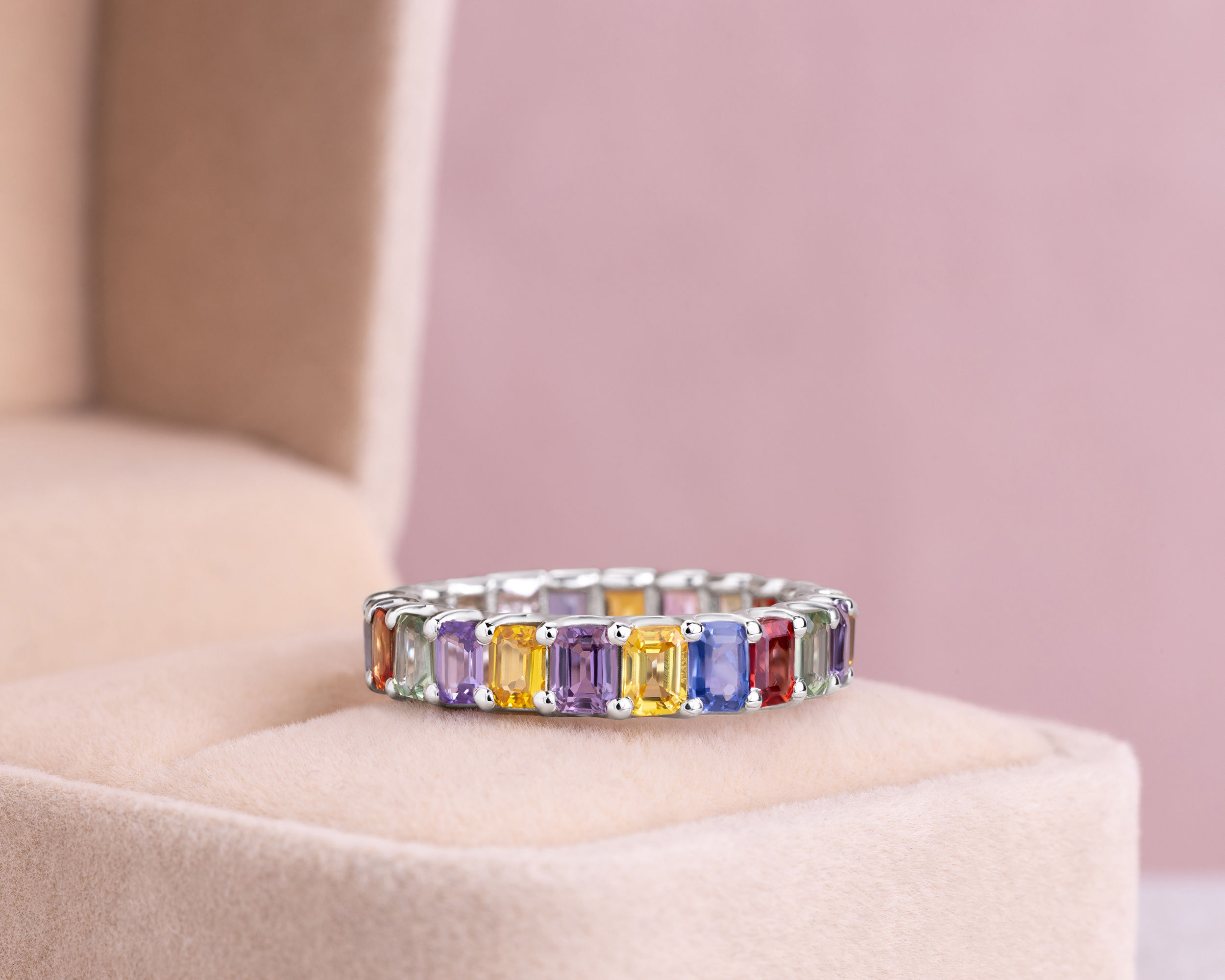 6.75 Ct Natural Sapphire Multi Colors Ring 14k White Gold Emerald Cut