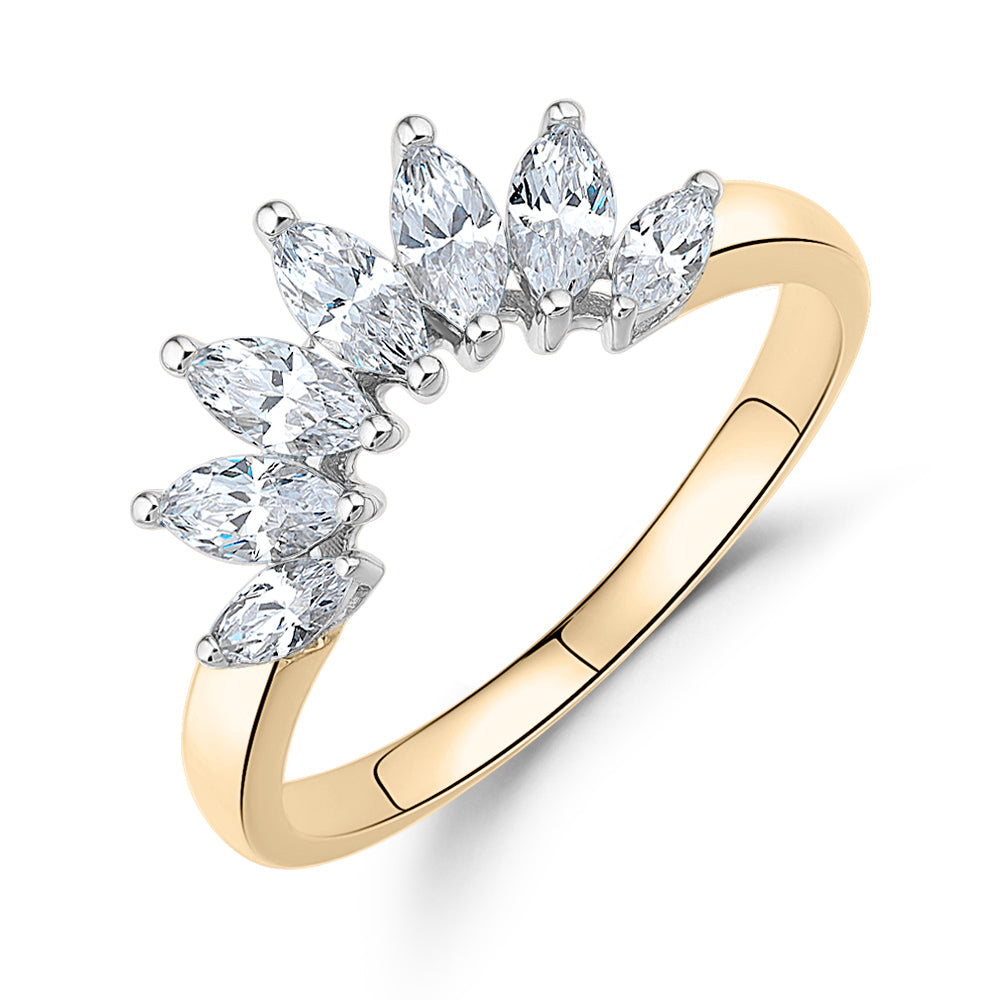 Curved wedding or eternity band with 0.48 carats* of diamond simulants in 14 carat yellow and white gold