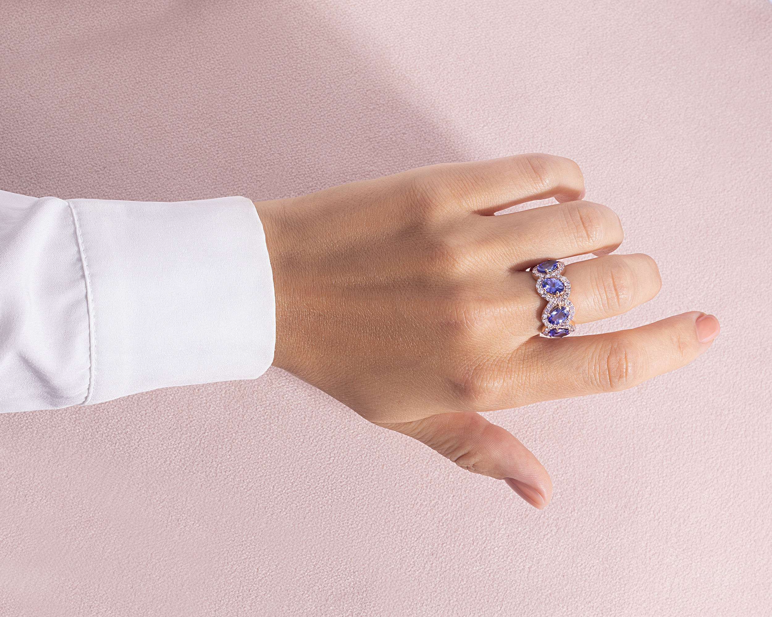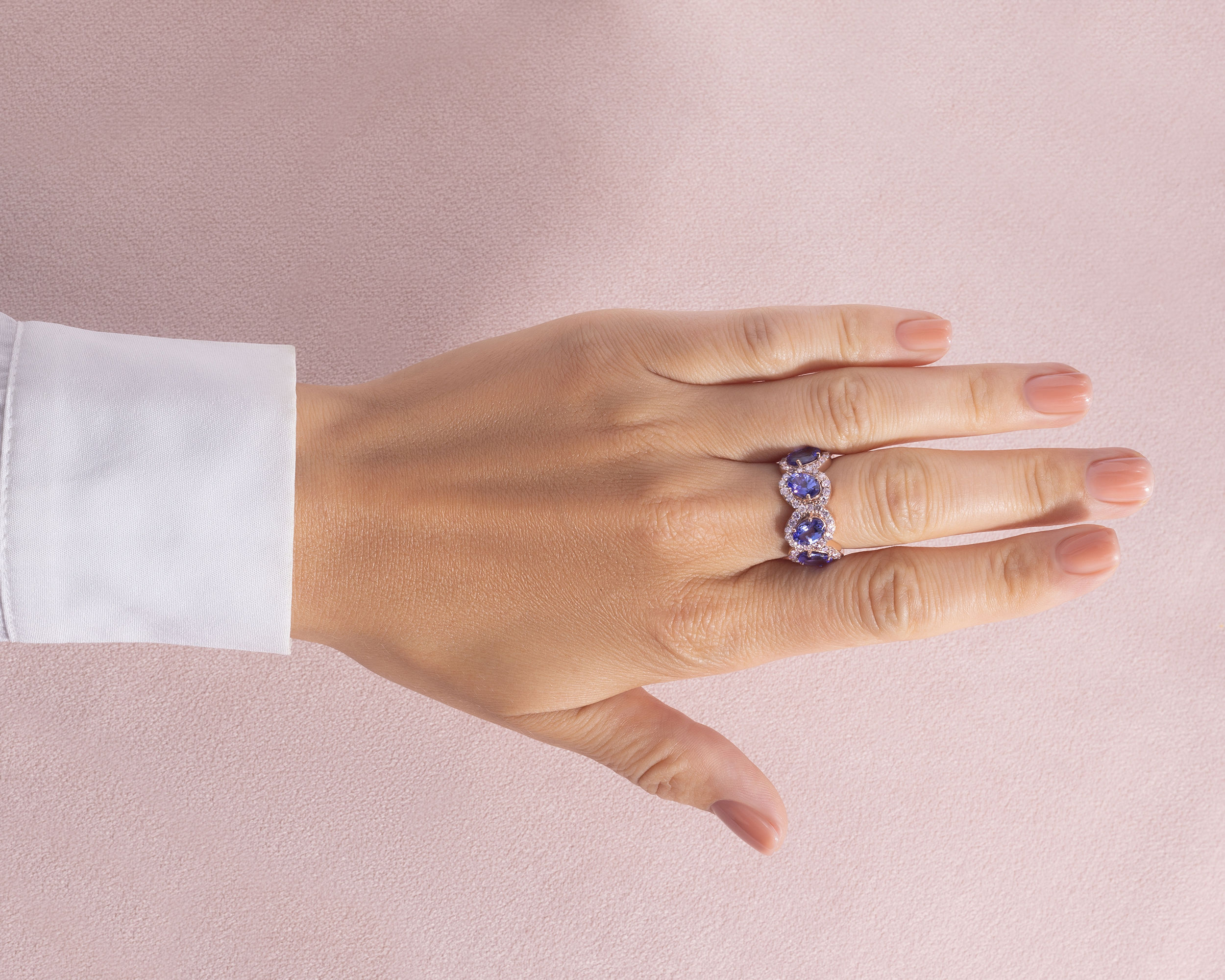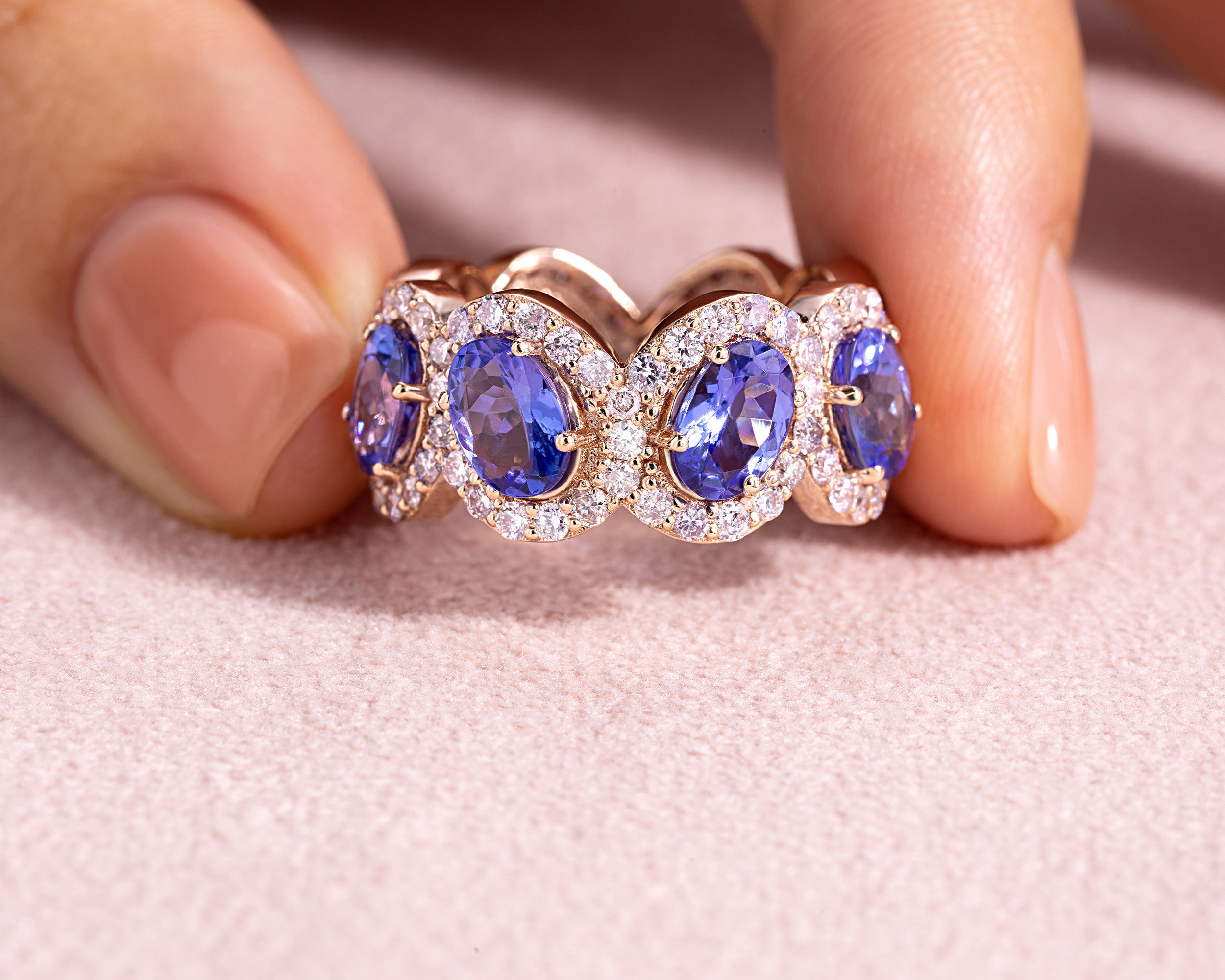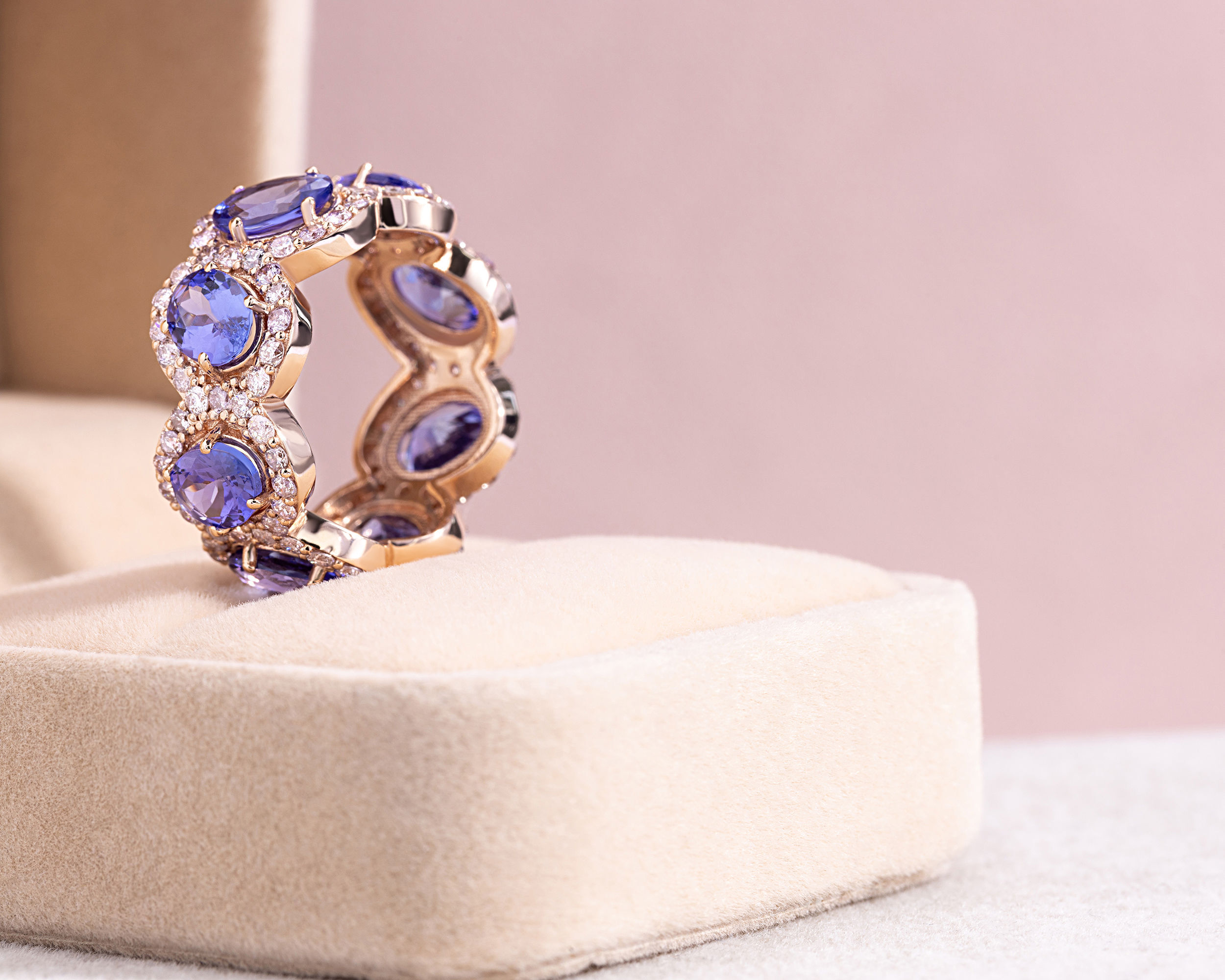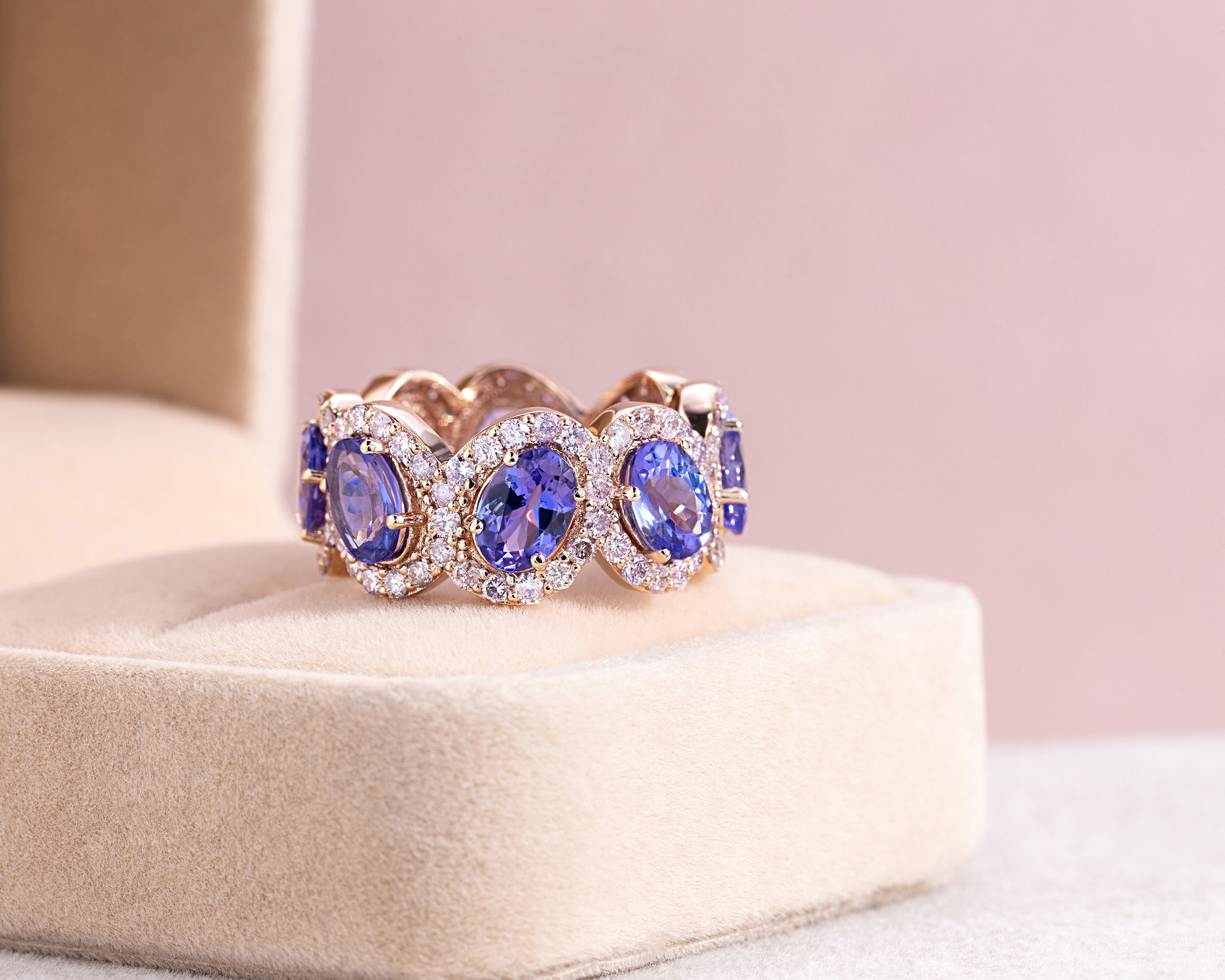 8.4 Ct Violetish Blue Tanzanite & Natural Diamond 14k Rose Gold Halo Eternity Ring