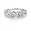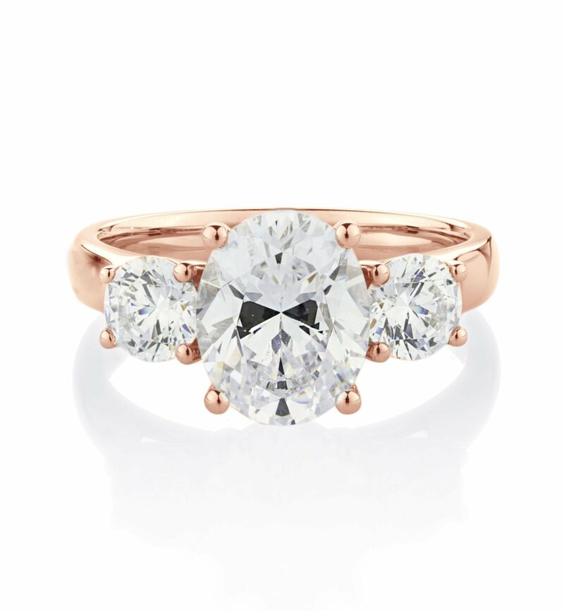 Three stone ring with 3.5 carats* of diamond simulants in 10 carat rose gold