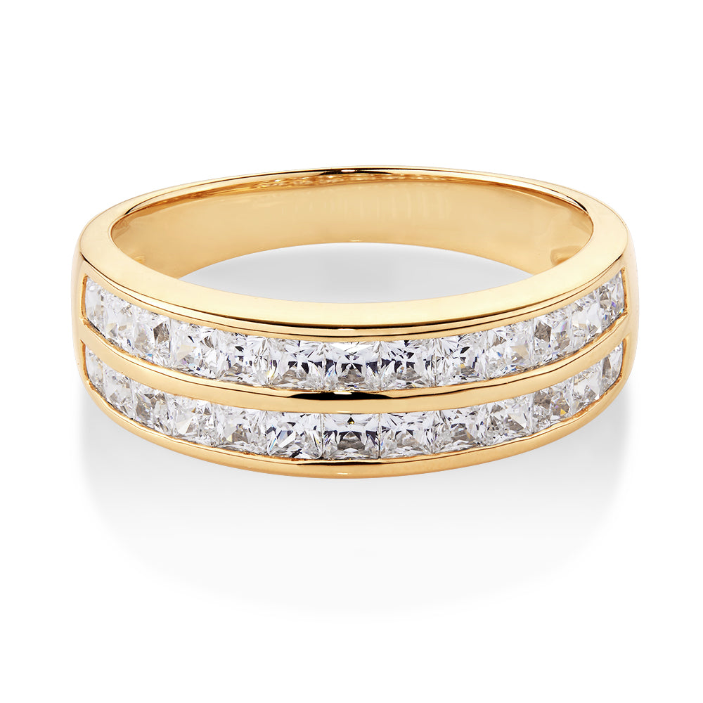 Wedding or eternity band with 1.56 carats* of diamond simulants in 10 carat yellow gold